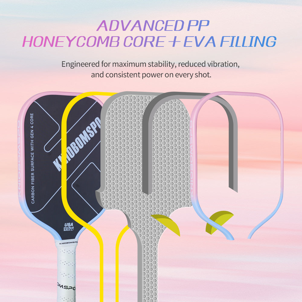 GEN4 paddle delivers stable rebound and precise control with a reinforced PP honeycomb core and premium T700 carbon fiber face — ideal for daily training and club play.